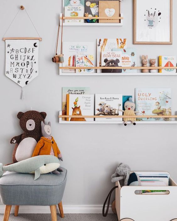 - Les livres : si votre enfant à une très grande collection de livres, prenez le temps de choisir les livres qui seront déposés sur les étagères. Renouvelez régulièrement les albums pour écarter tout risque de lassitude de la part de votre chère tête blonde.
