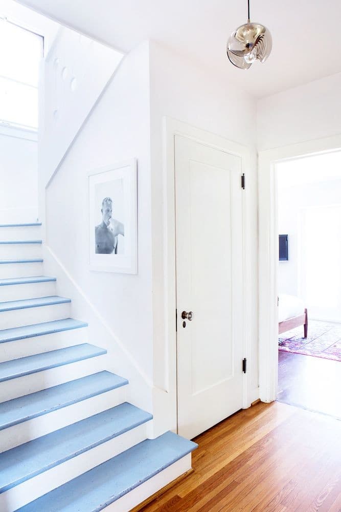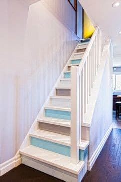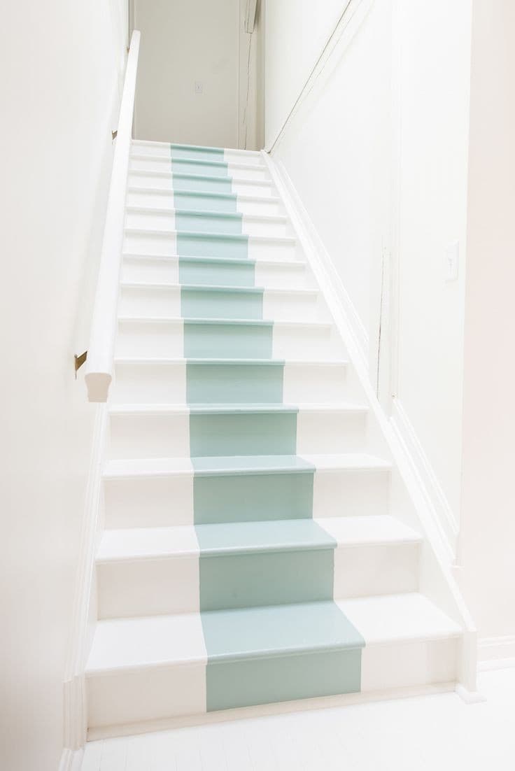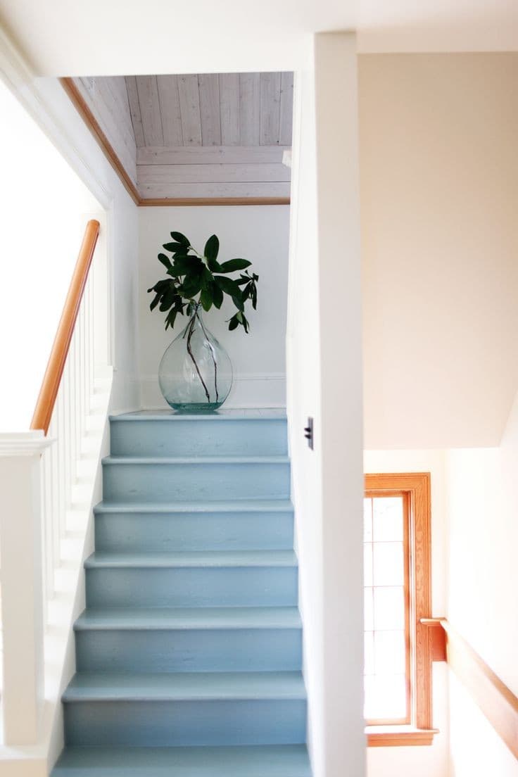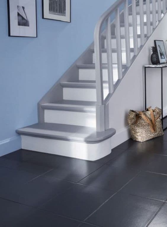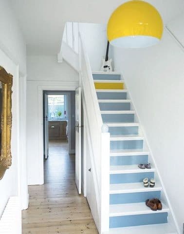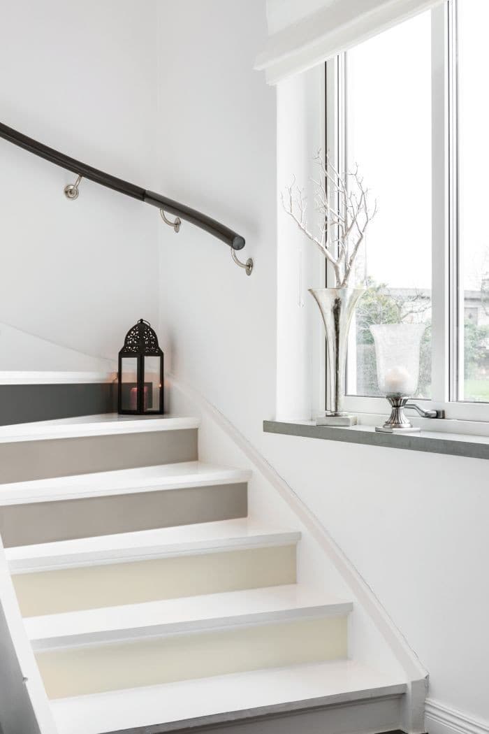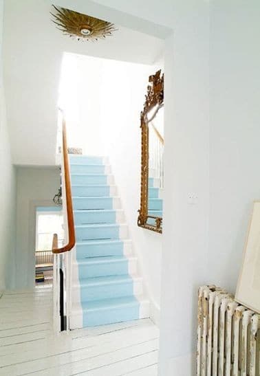 - Peindre les escaliers : avec une bonne peinture, vous pouvez refaire l’escalier intégralement ! Vous pouvez utiliser 2 couleurs pour amener un peu plus de luminosité en peignant les contres-marches.
